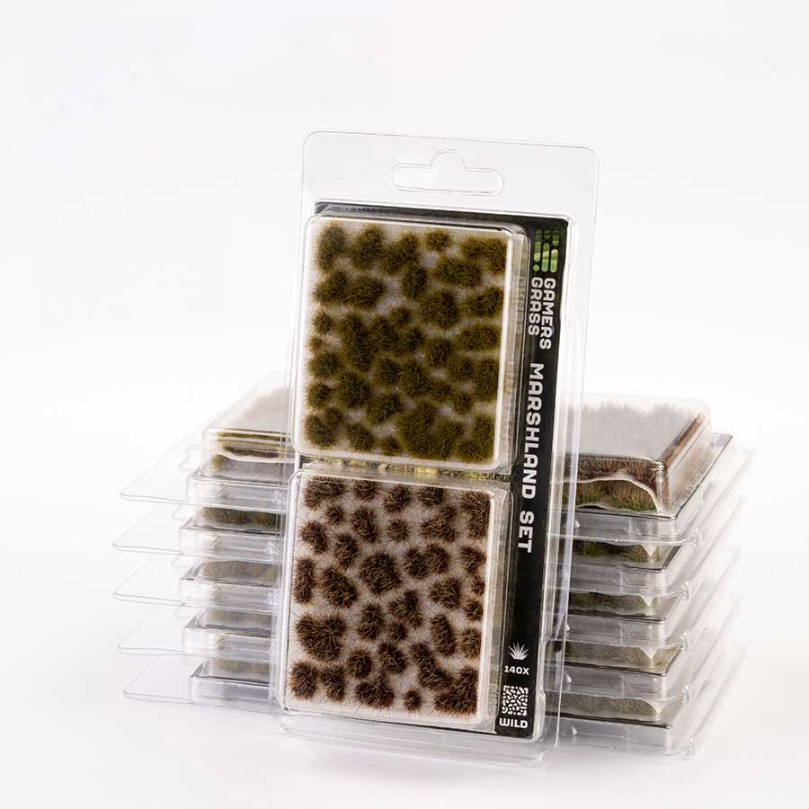 This colour set includes a diversity of tufts with green, brownish and light tips, with darker brown bases. They simulate waterlogged or sunless plants under shadow. Best used to recreate marsh and peat landscapes, or shadowy grasslands undergrowth dark forests and scrubs.