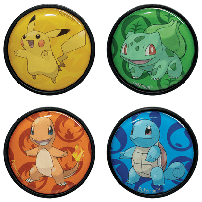 Comes with four 1.5 in. magnetic badges, featuring Charmander, Bulbasaur, Squirtle, and Pikachu